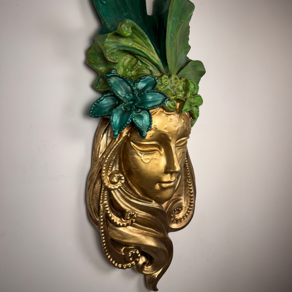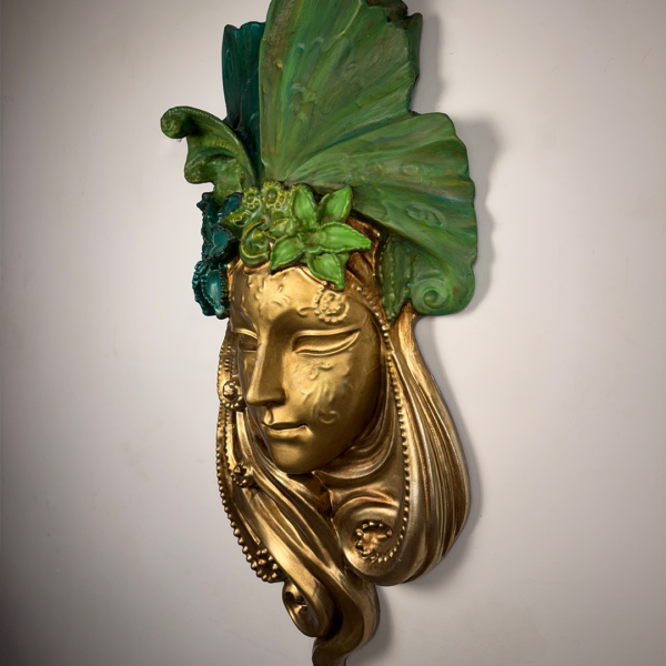 Sanatı ve doğayı bir araya getiren altın detaylı kadın yüzü duvar dekoru, yaşam alanlarına zarafet ve ihtişam katıyor. El boyaması detayları ve yaprak dokusu ile modern ve klasik dekorasyon stillerine güçlü bir uyum sağlar.